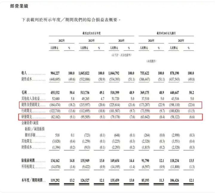 面对增长瓶颈,SKG选择的解题思路依然是路径依赖式的“砸钱营销”。2022年至2025年前三季度,公司的销售及营销开支占比从18.2%一路攀升至22.6%,然而费用的投入并未换来等比例的营收增长,边际效应递减明显。与此同时,代表企业未来竞争力的研发费用占比却从9.1%一路下滑至6.6%。