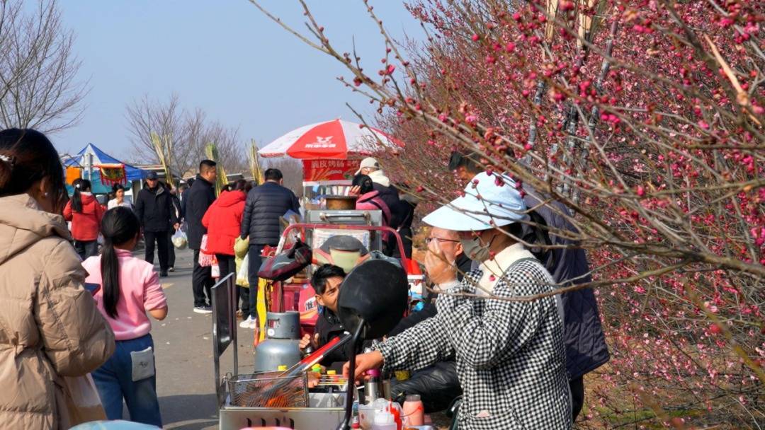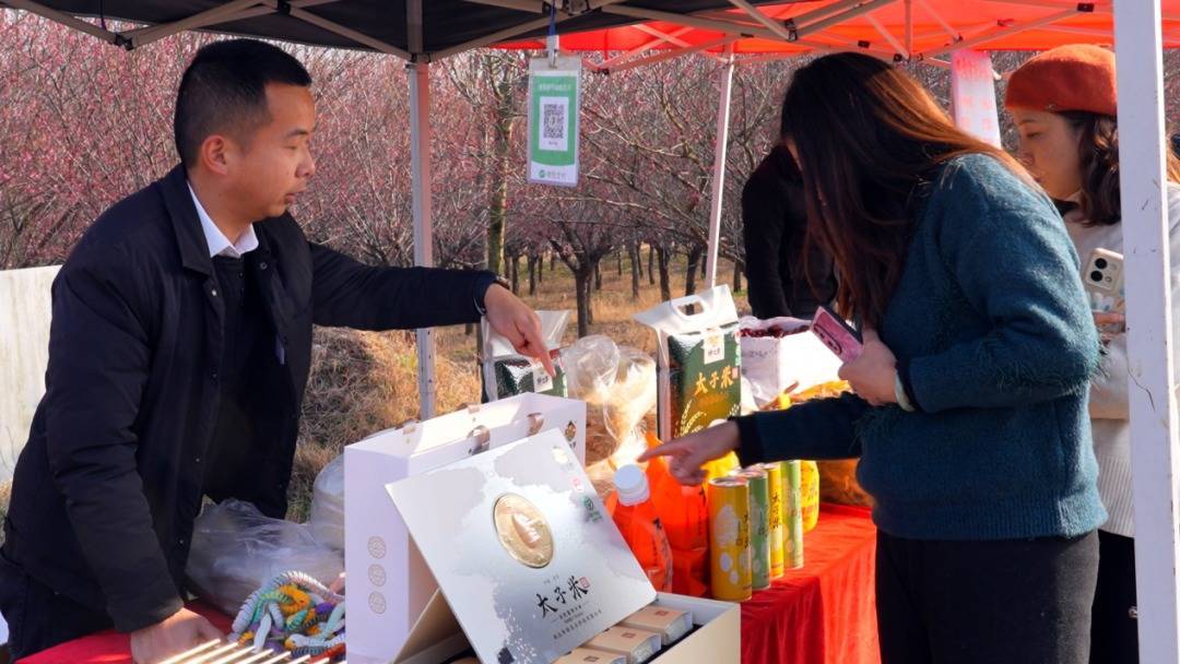 梅花盛放带旺了旅游热度,更激活了乡村经济的“一池春水”。梅园周边,村民们自发设立摊位,摆满太子米、土鸡蛋等本地农特产品,在便利游客的同时,拓宽了增收渠道,让“赏花经济”实实在在转化为增收红利。