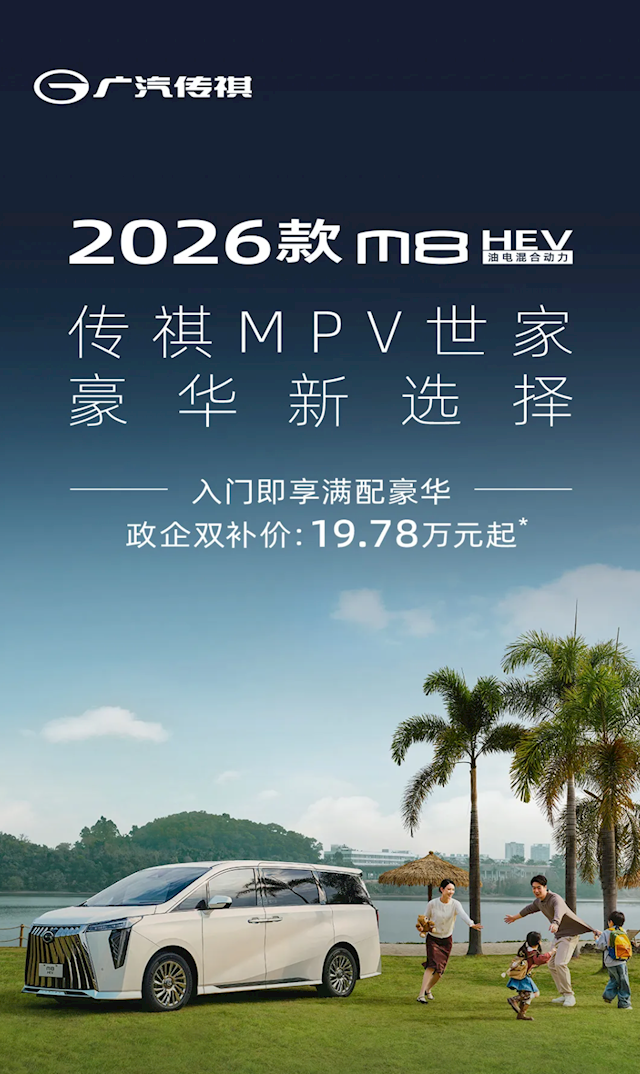 2026款广汽传祺M8 HEV正式上市,新车定位中大型混动MPV,推出尊贵版、至尊版两款配置,官方指导价分别为21.98万元、23.98万元。