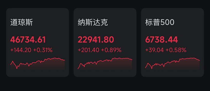 当地时间周四,美股三大股指全线收涨。截至收盘,道指涨0.31%报46734.61点,标普500指数涨0.58%报6738.44点,纳指涨0.89%报22941.8点。
